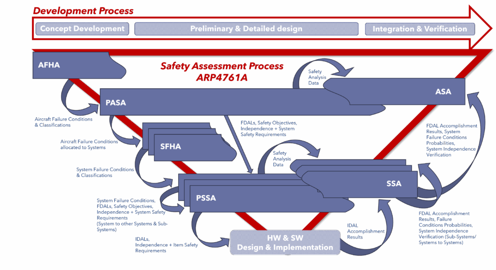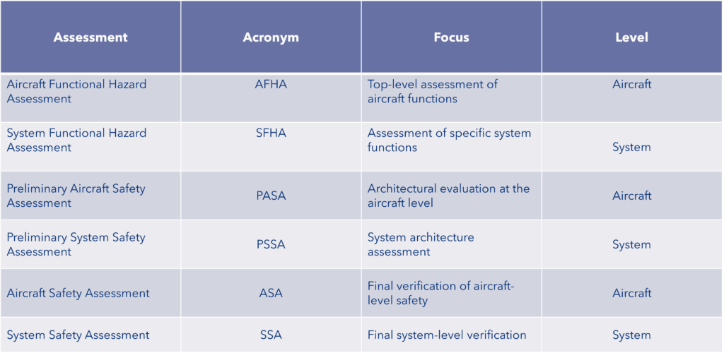 According to ARP4761A, the safety assessment process encompasses the following foundational assessment phases shown in the table below.