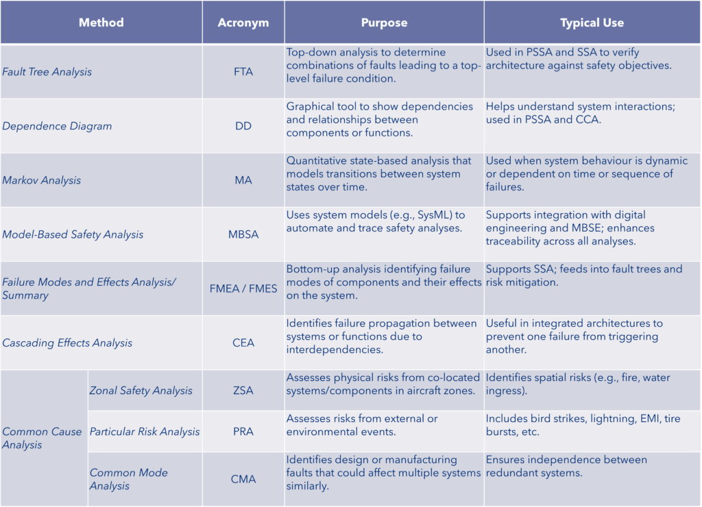 In addition, the ARP4761A defines a set of safety analysis methods, which support the six phases of the safety assessment: